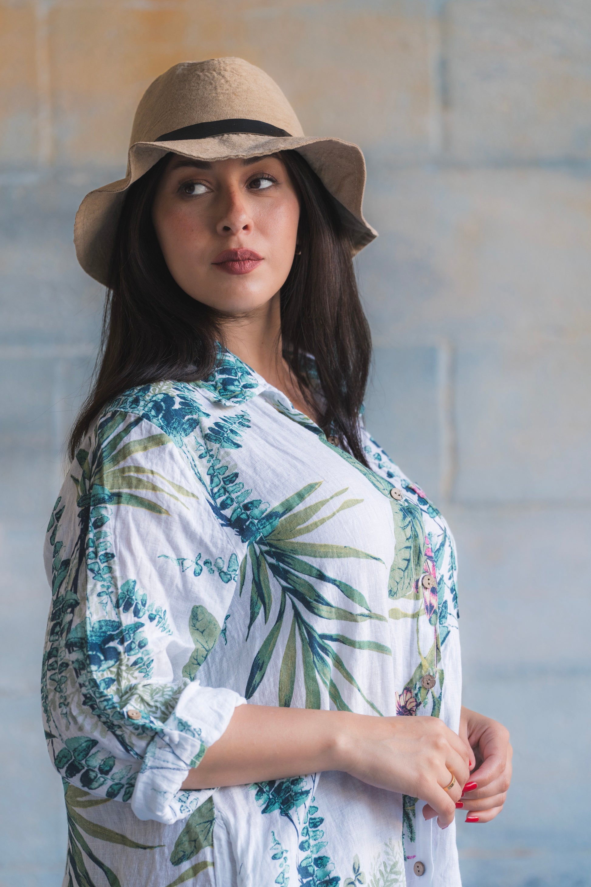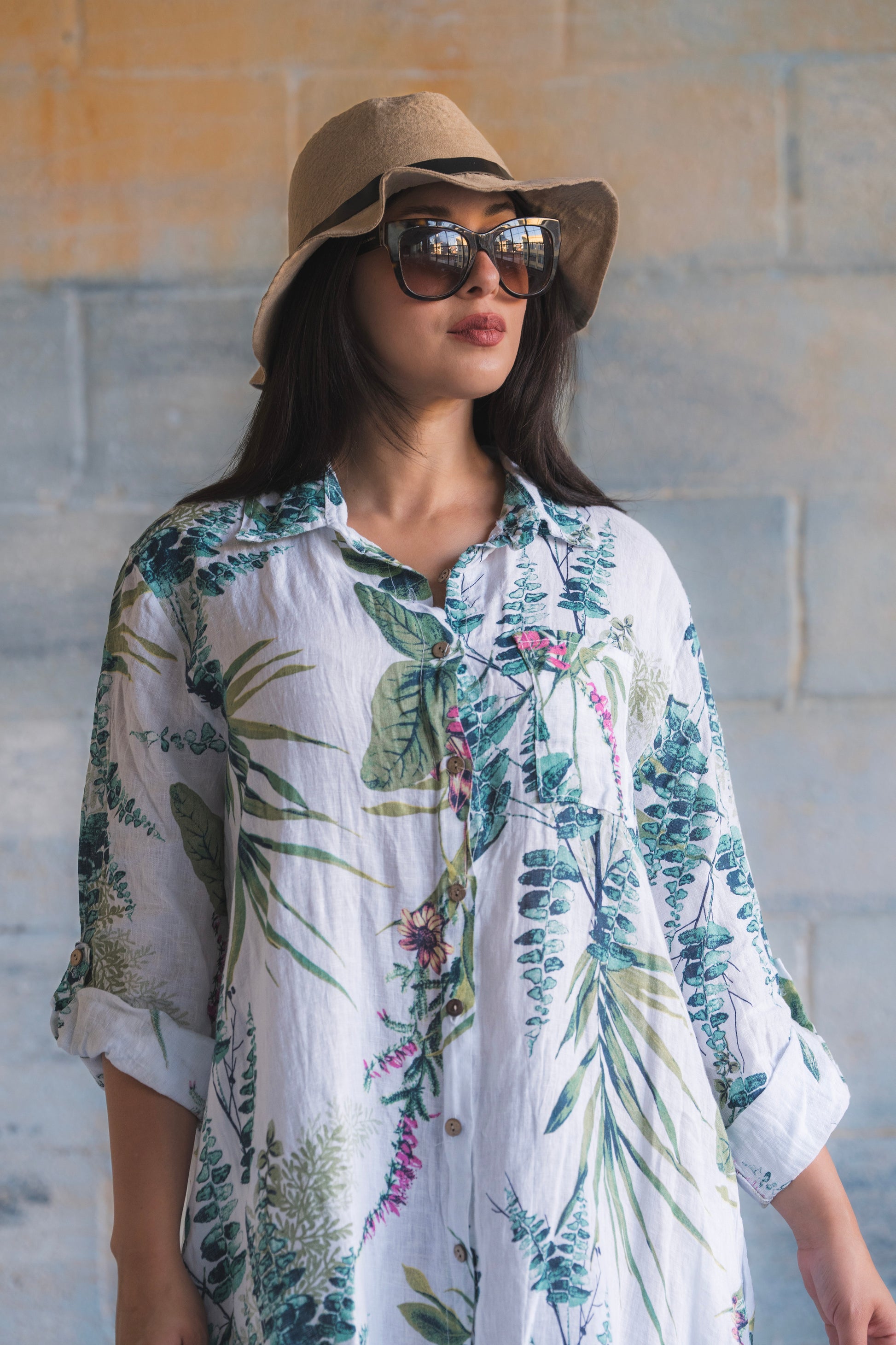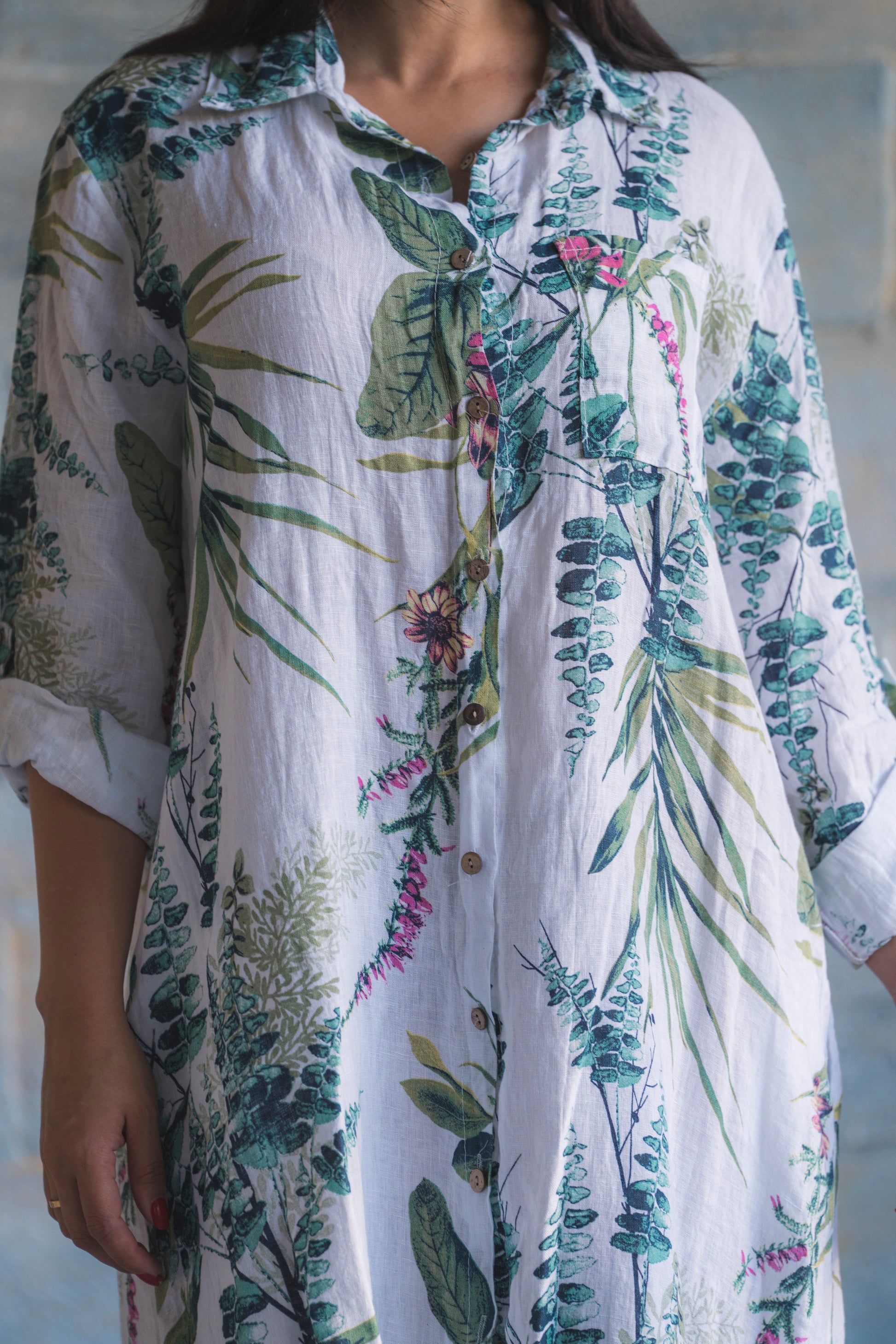 Long flowy maxi dress, featuring a botanical print with various shades of green, blue, and touches of pink and purple on a white background. It has a relaxed fit with long sleeves that can be rolled up. The dress is 100% linen ideal for warm weather.