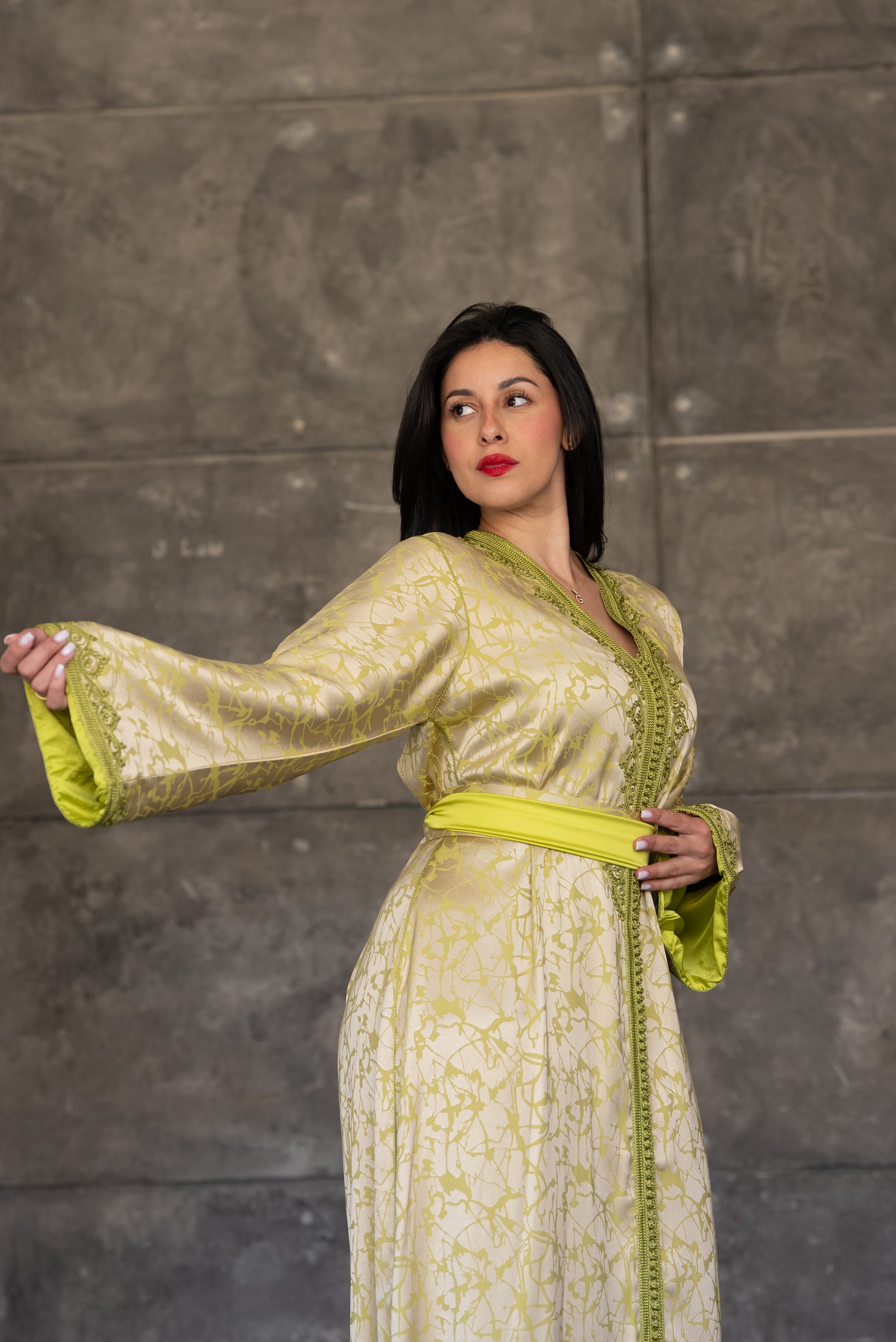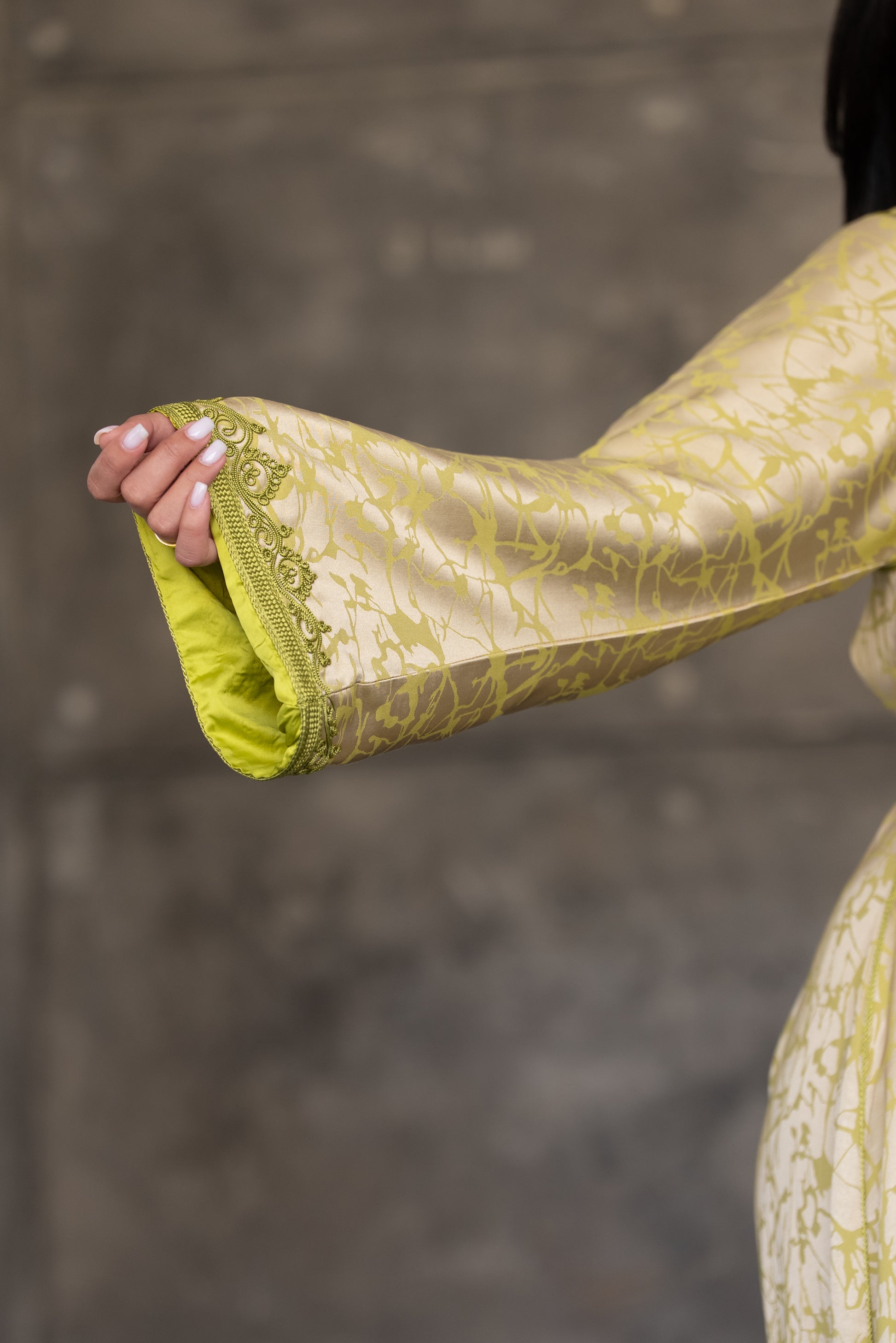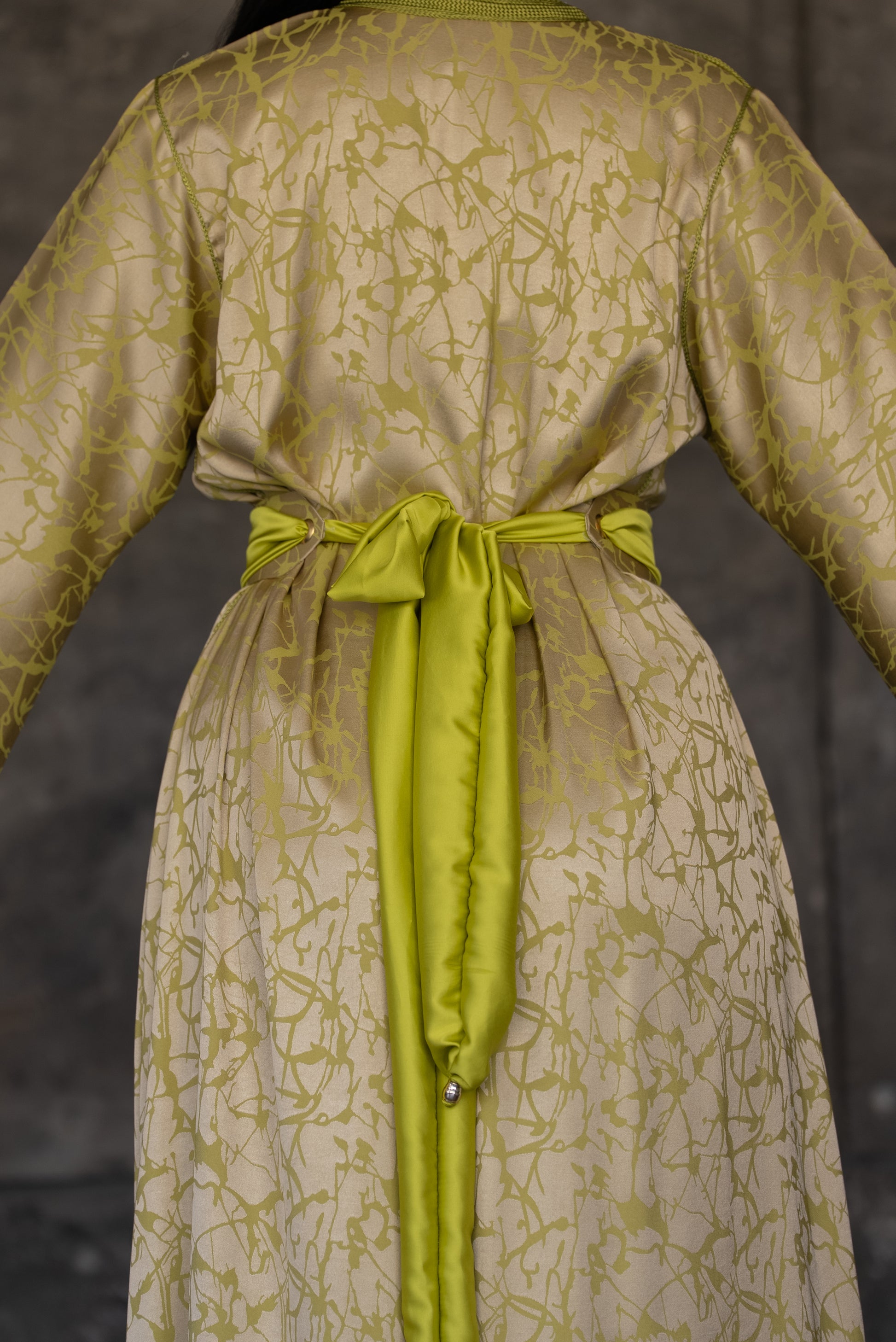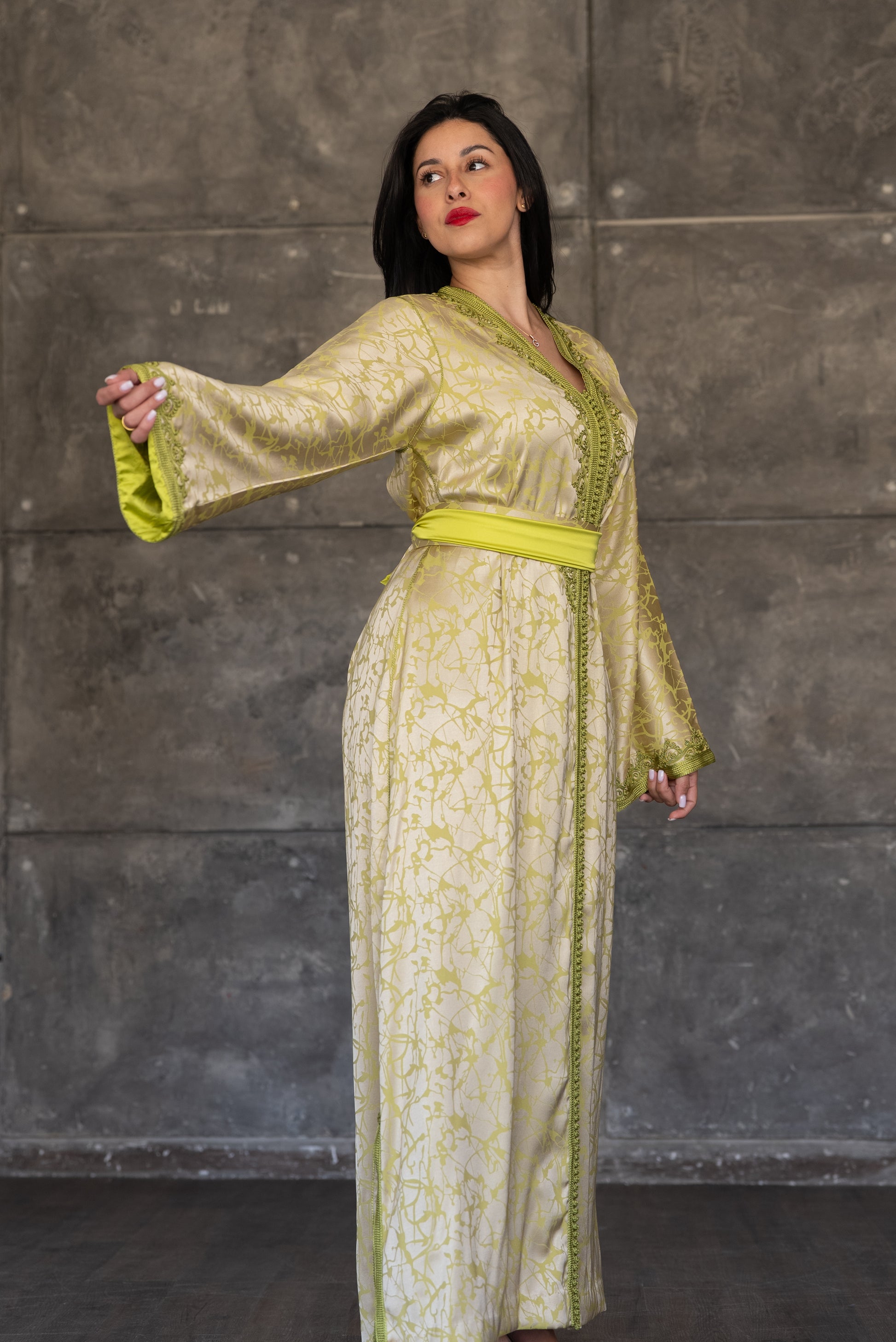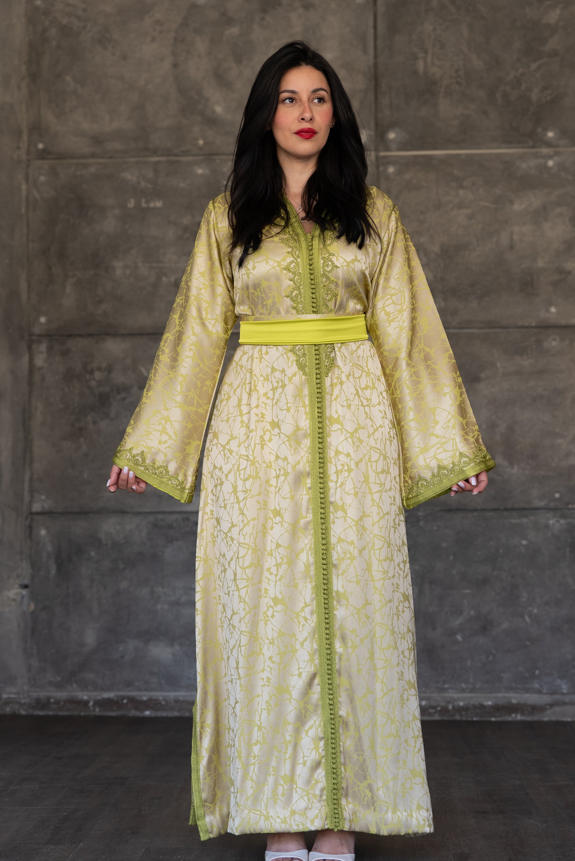 Lime Gold Satin Caftan with Embroidered Trim and Belt