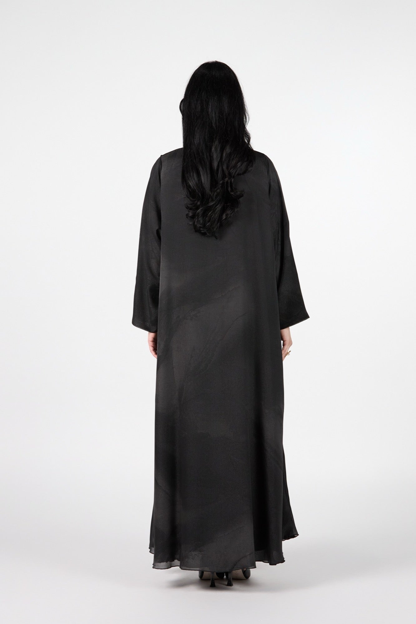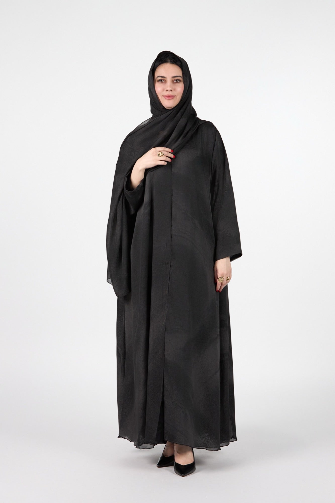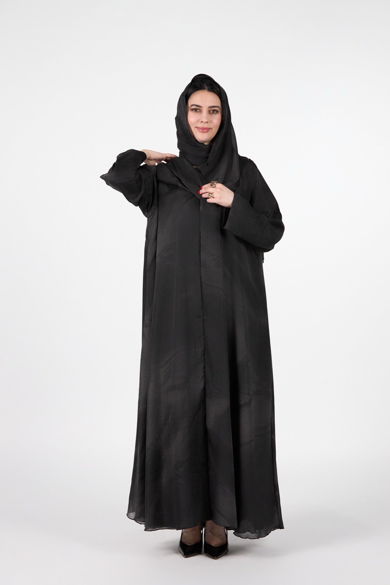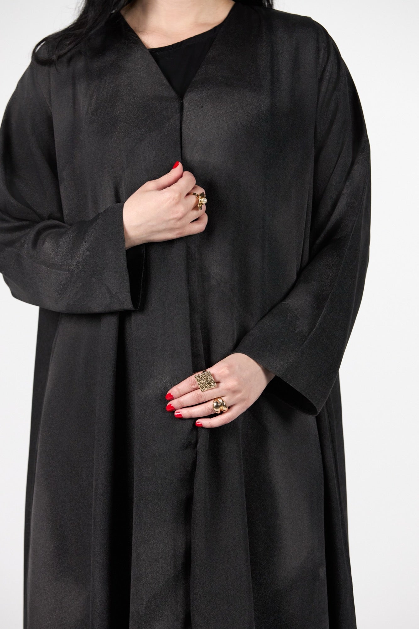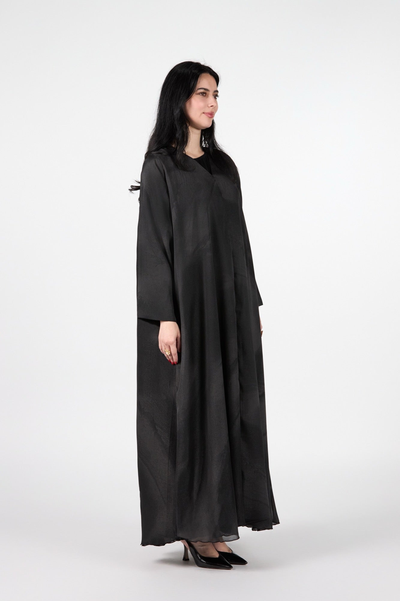 Effortless and refined, the Obsidian Veil Abaya embodies the essence of quiet luxury. Designed in a deep black tone with a smooth, fluid finish, this piece focuses on purity of silhouette and graceful movement.