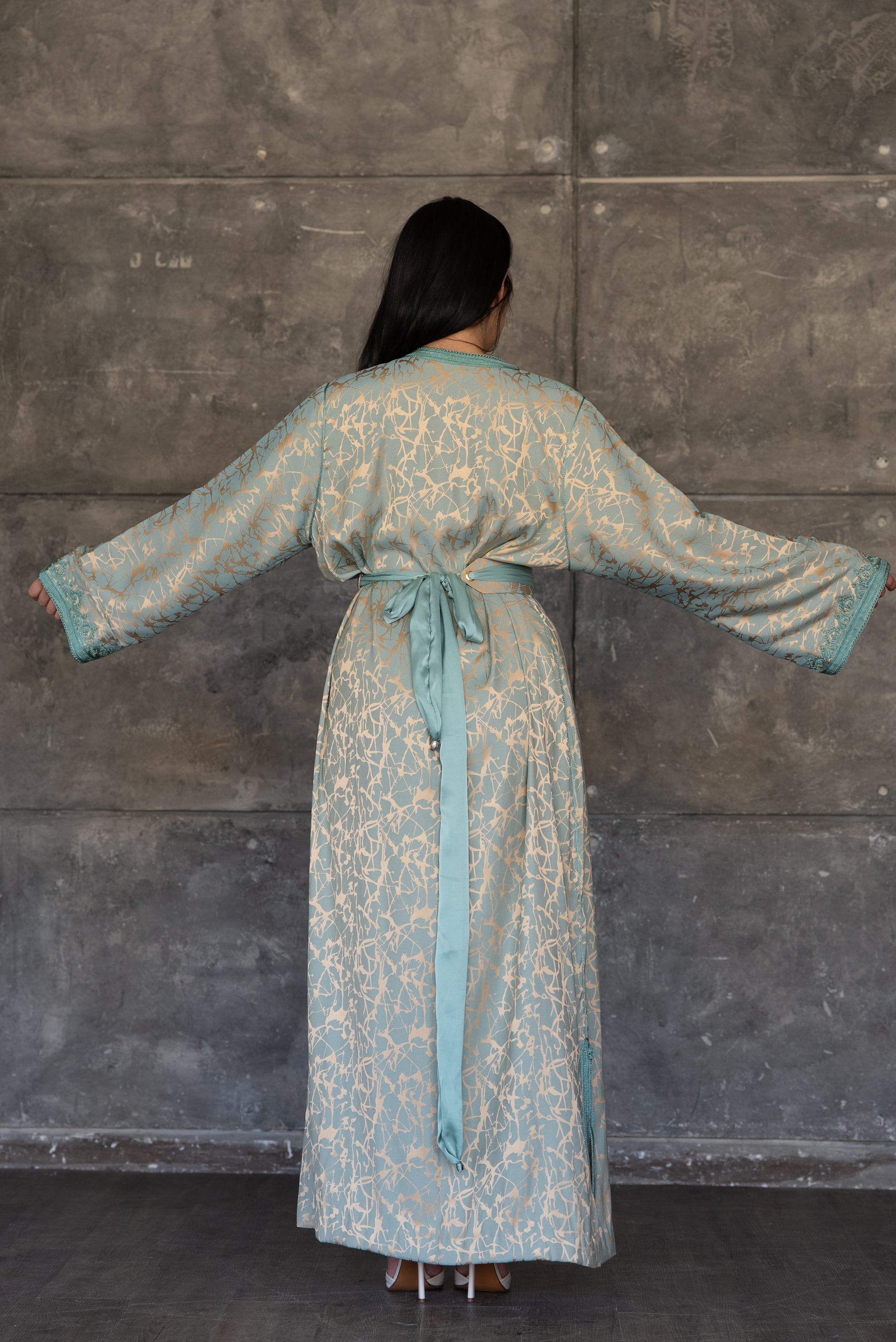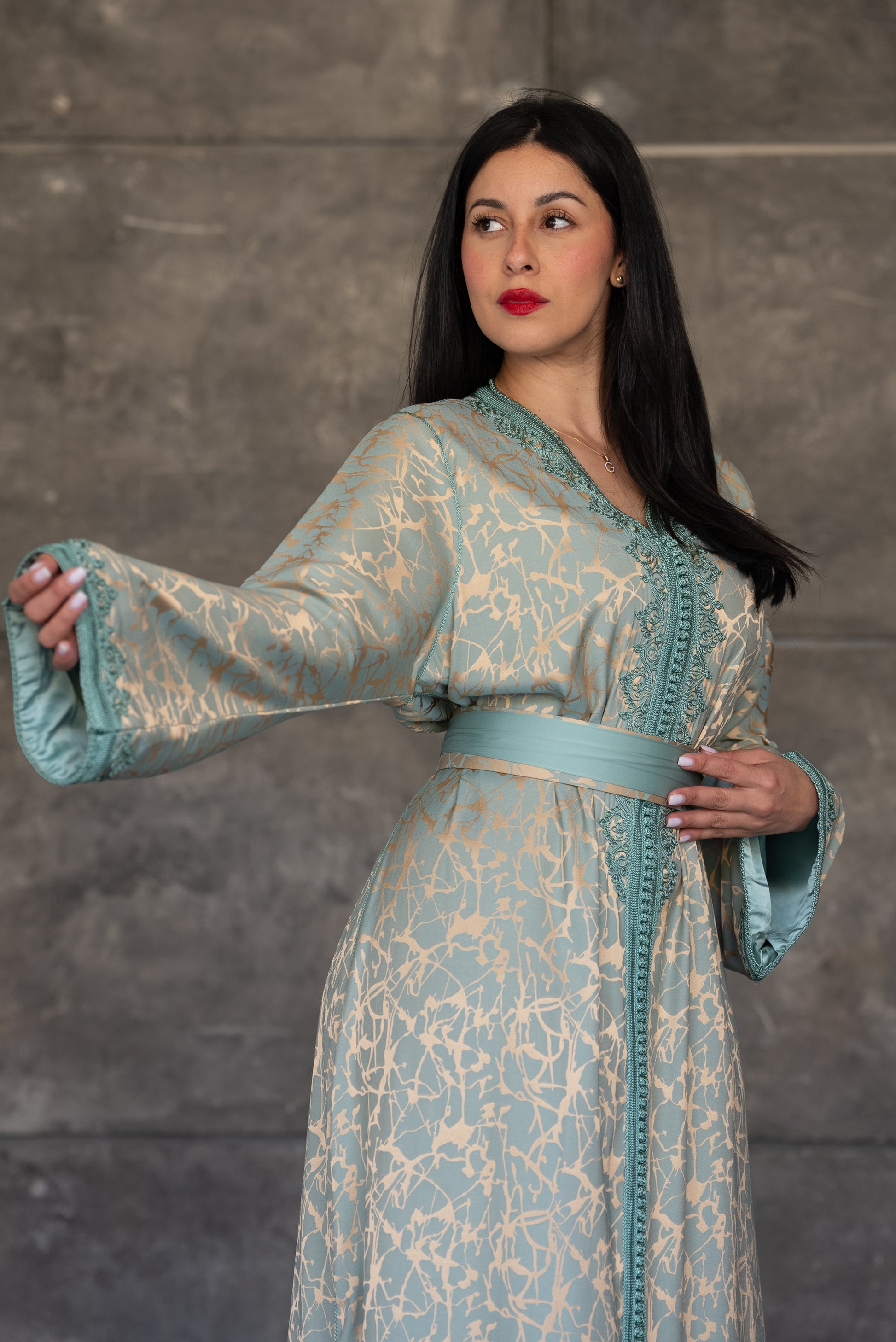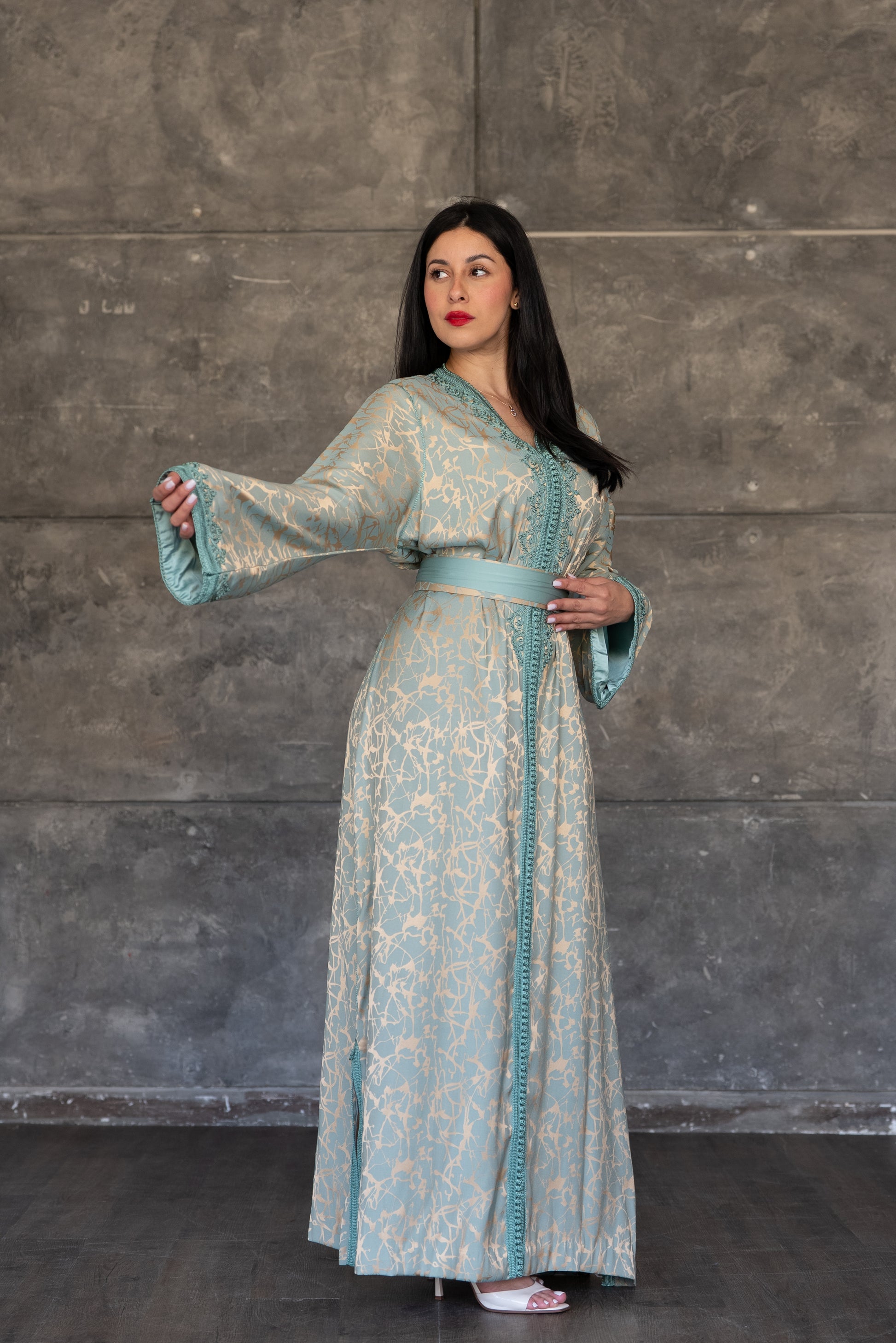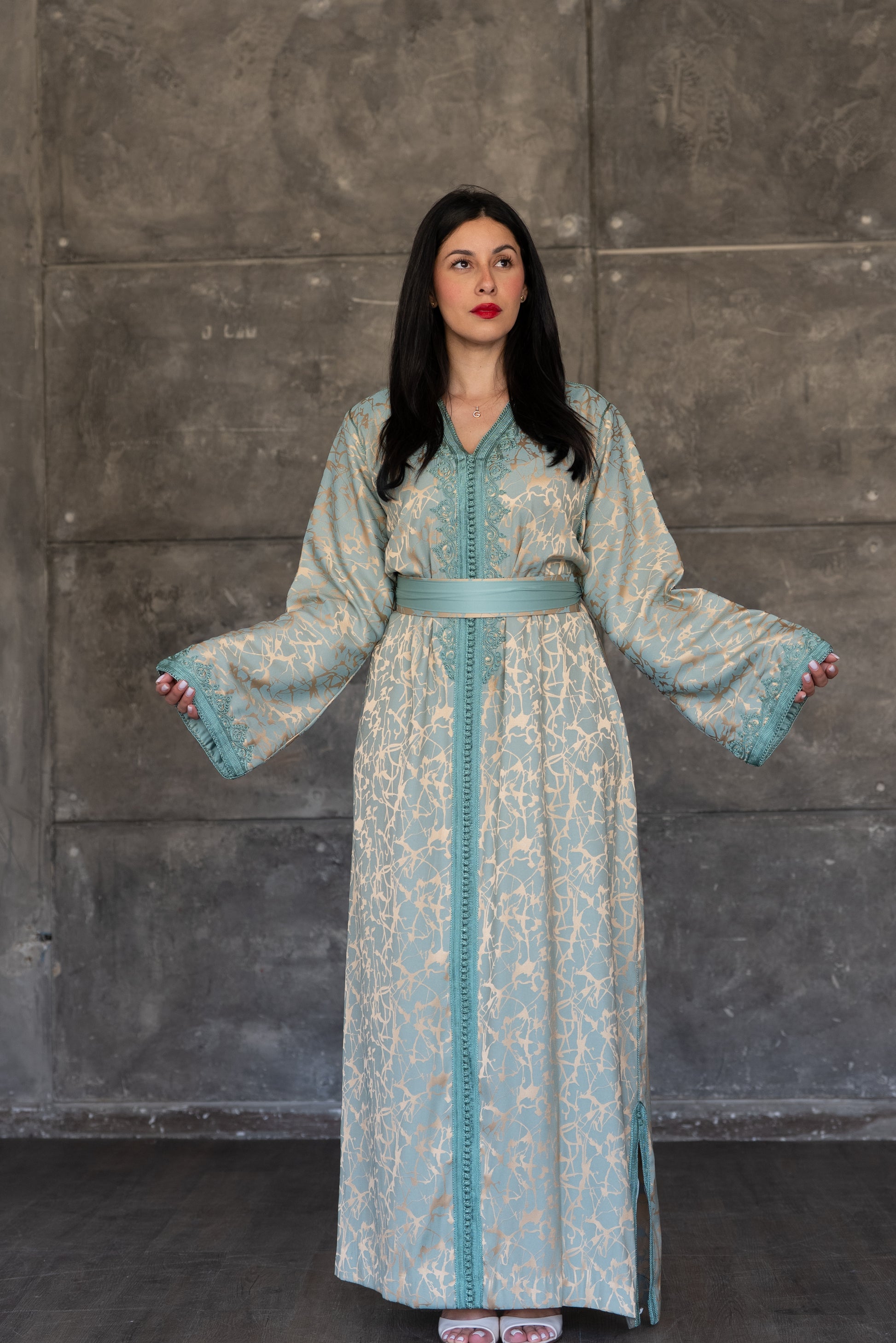 Pistachio Green Caftan with Embroidered Trim and Belt