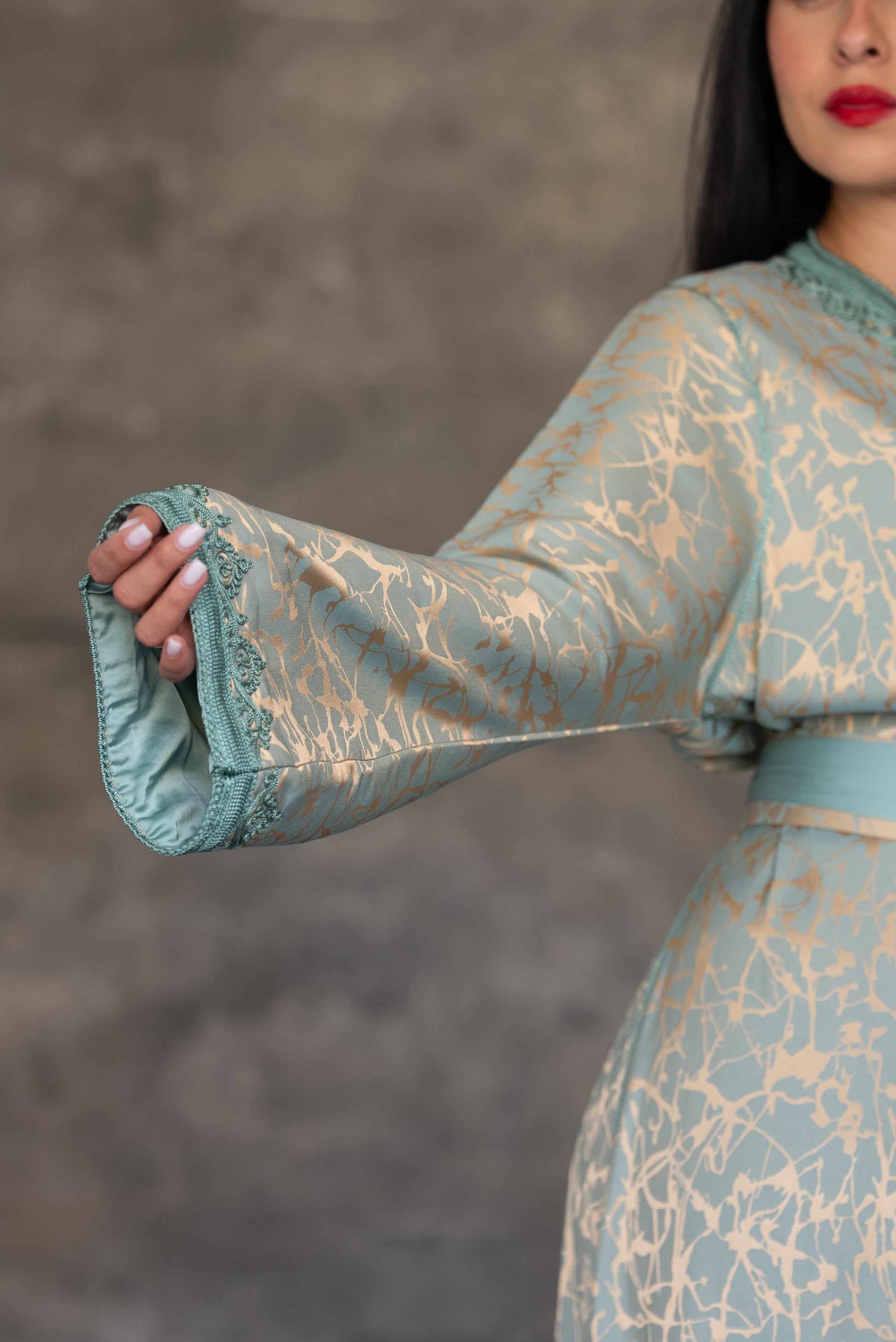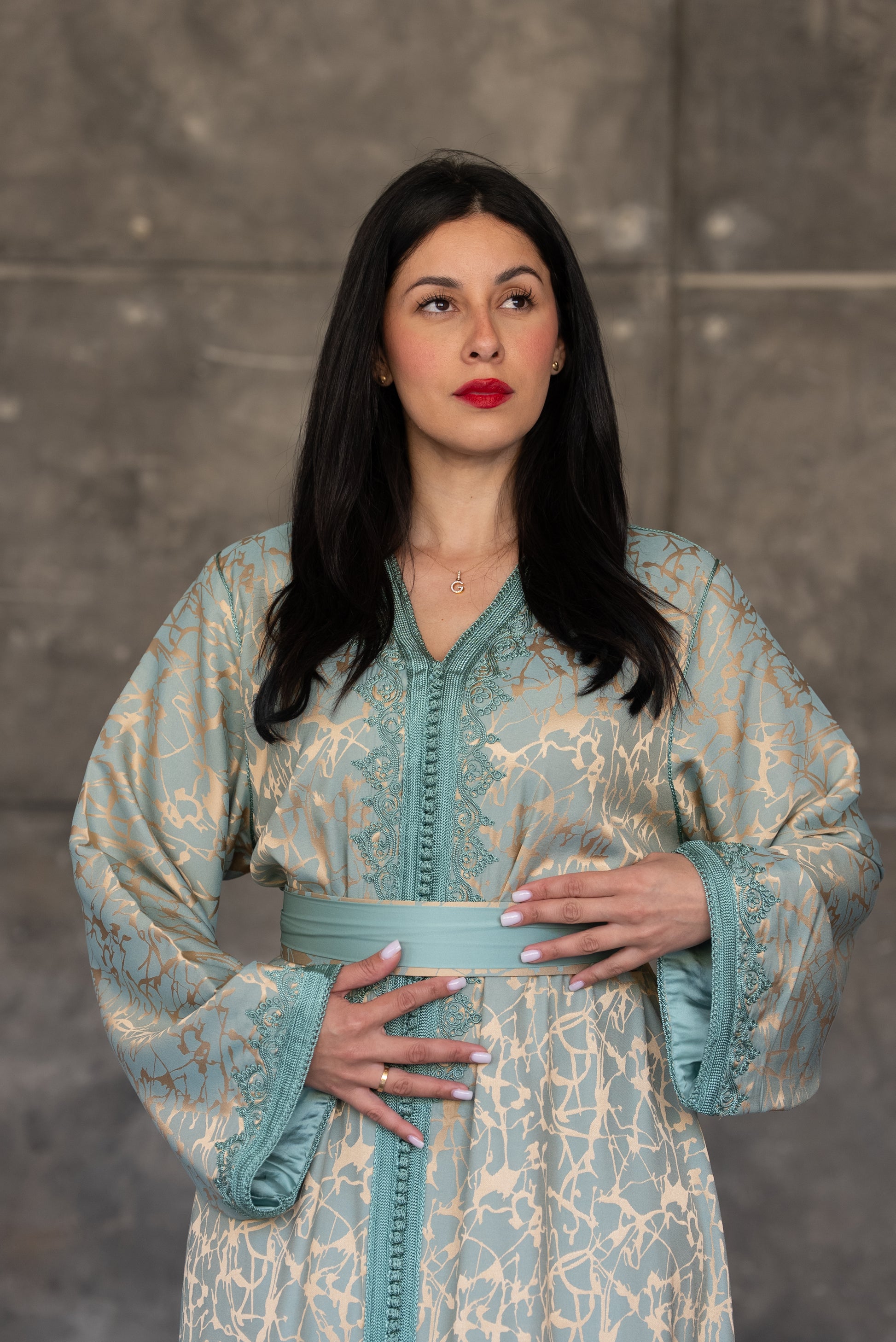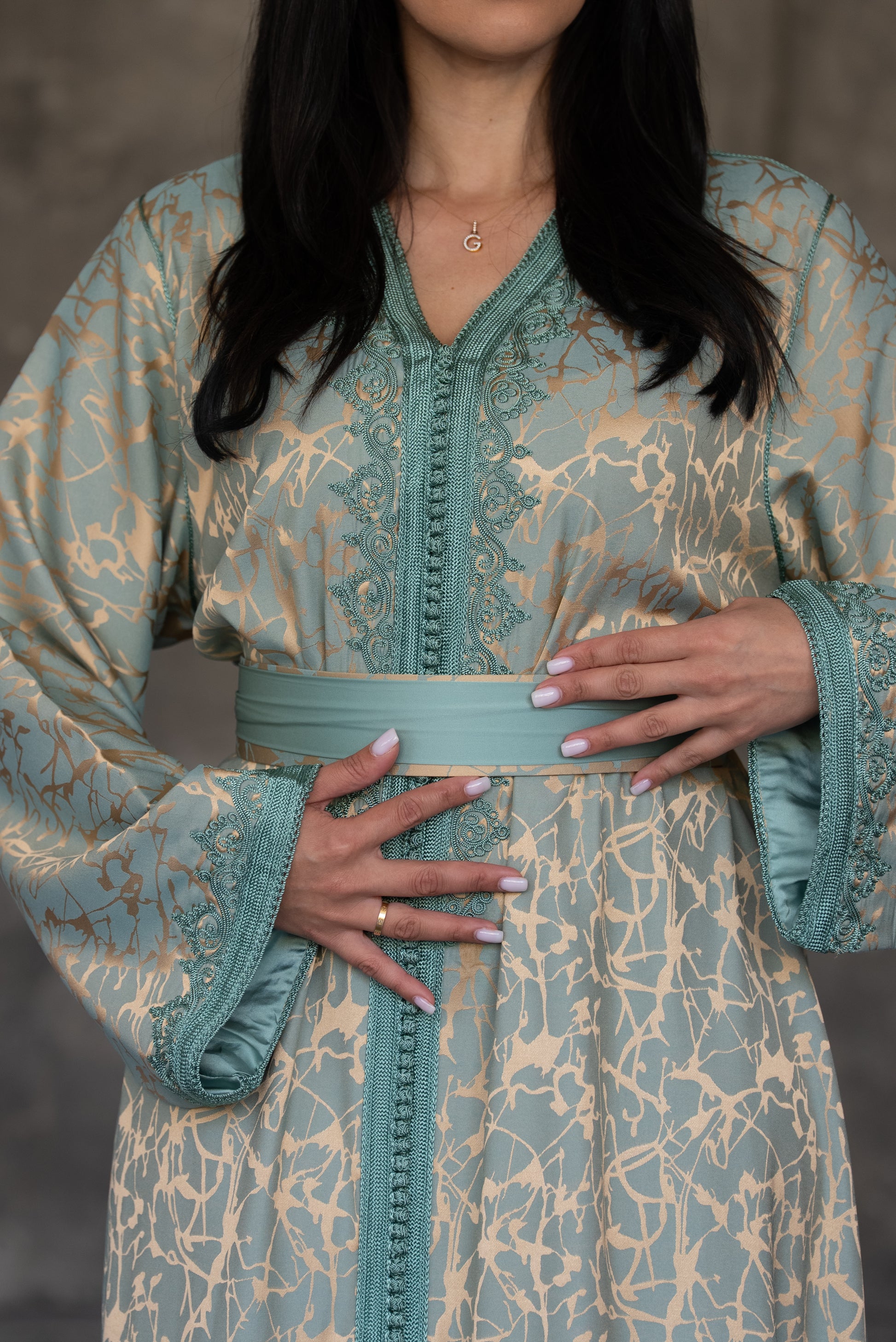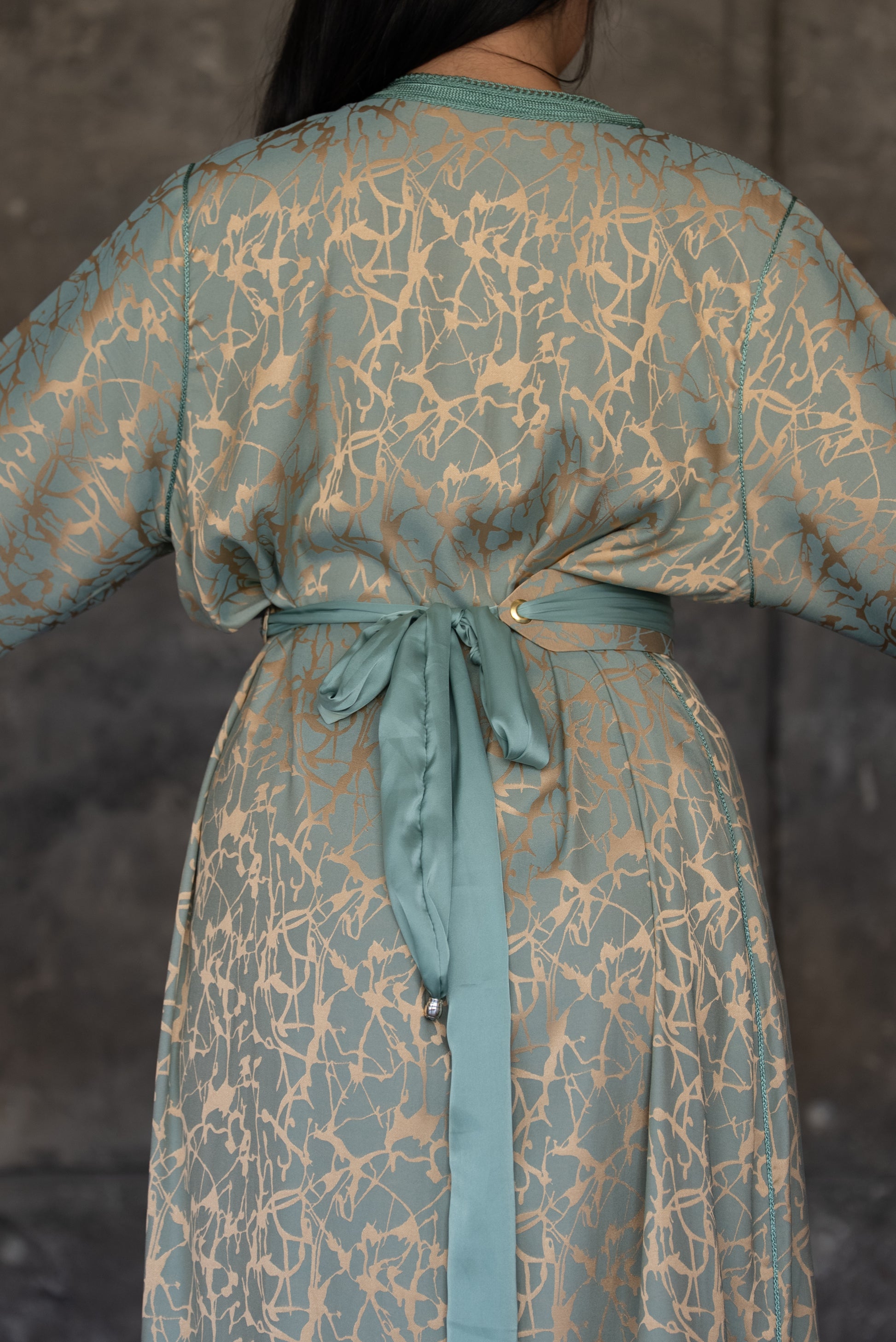 Pistachio Green Caftan with Embroidered Trim and Belt