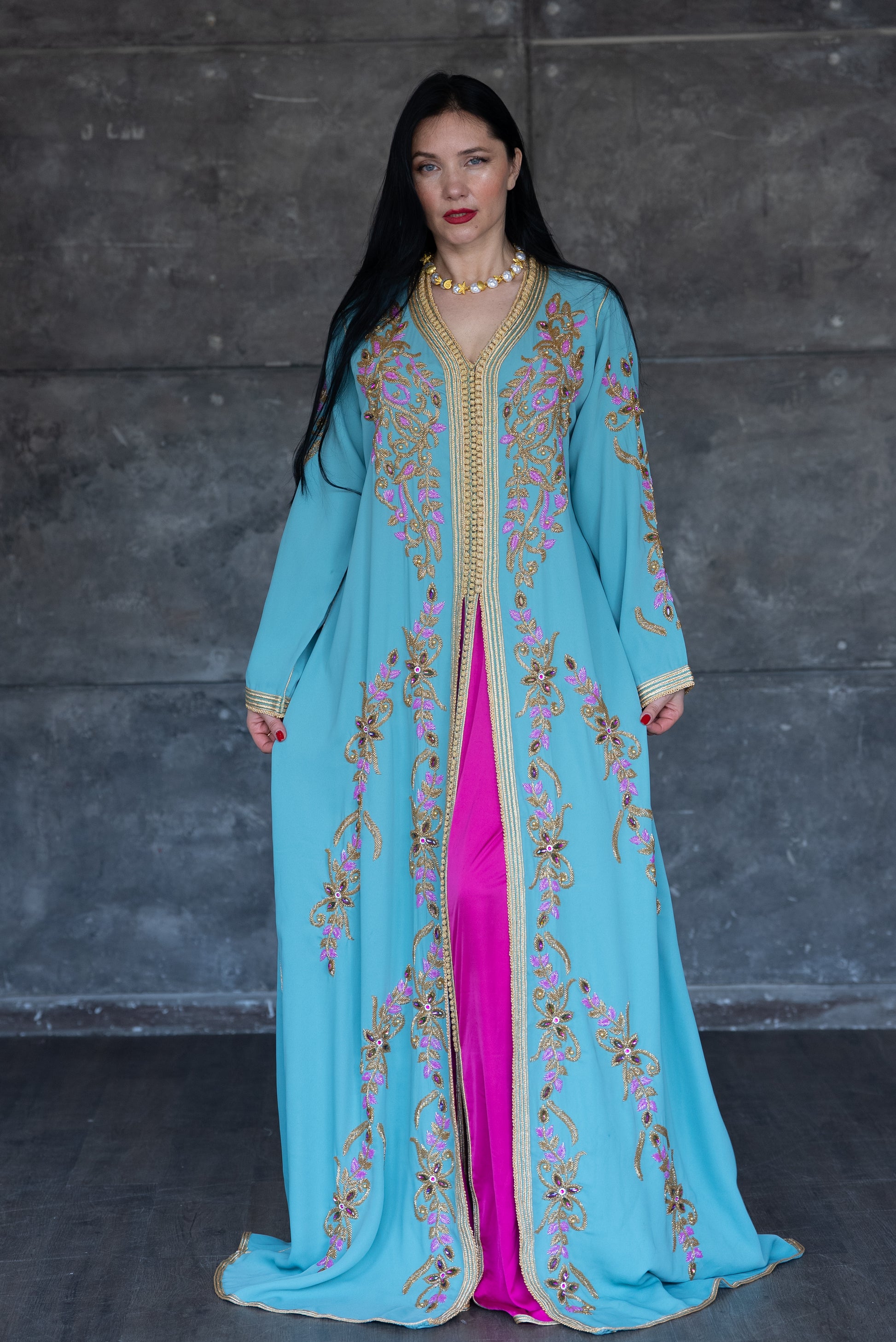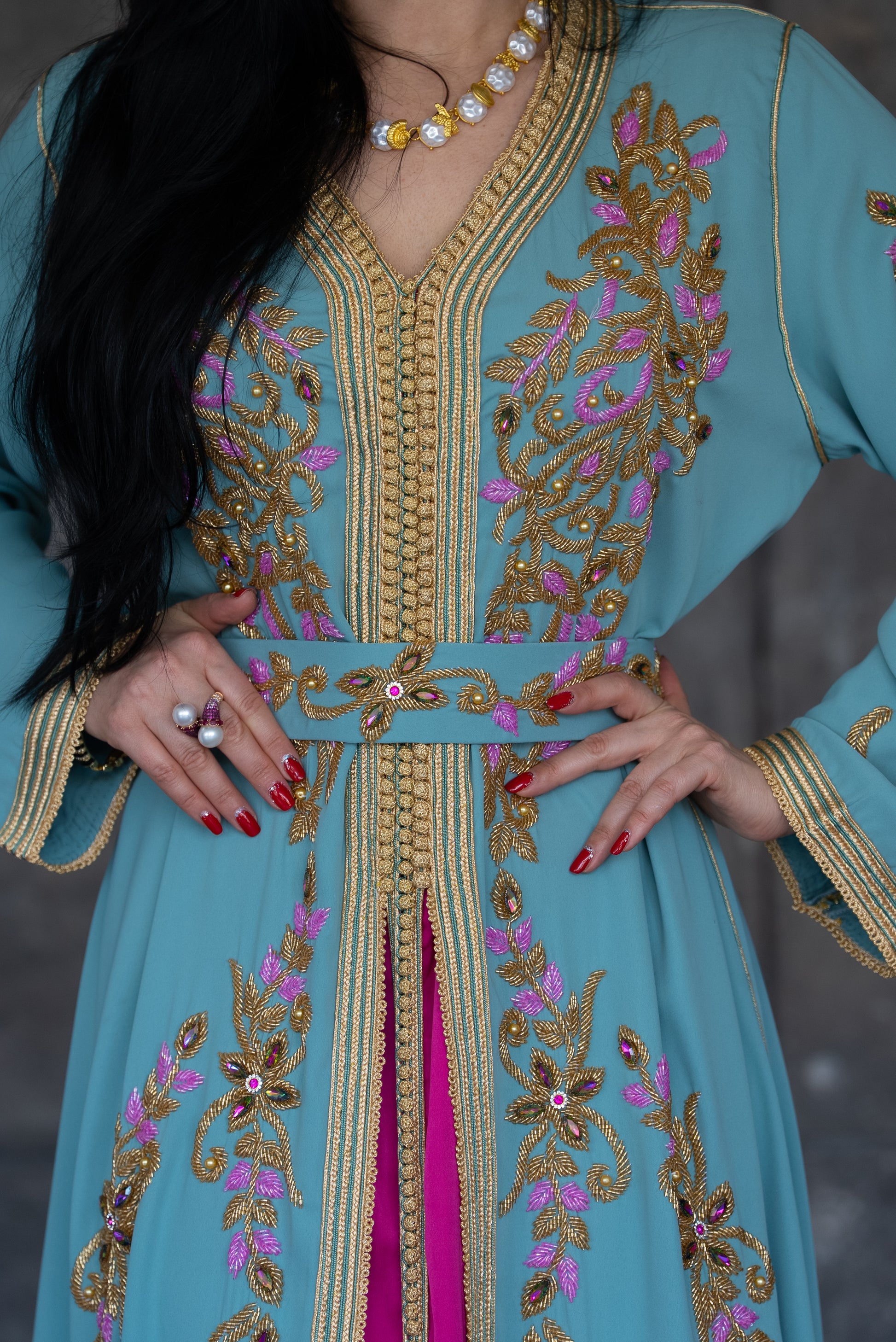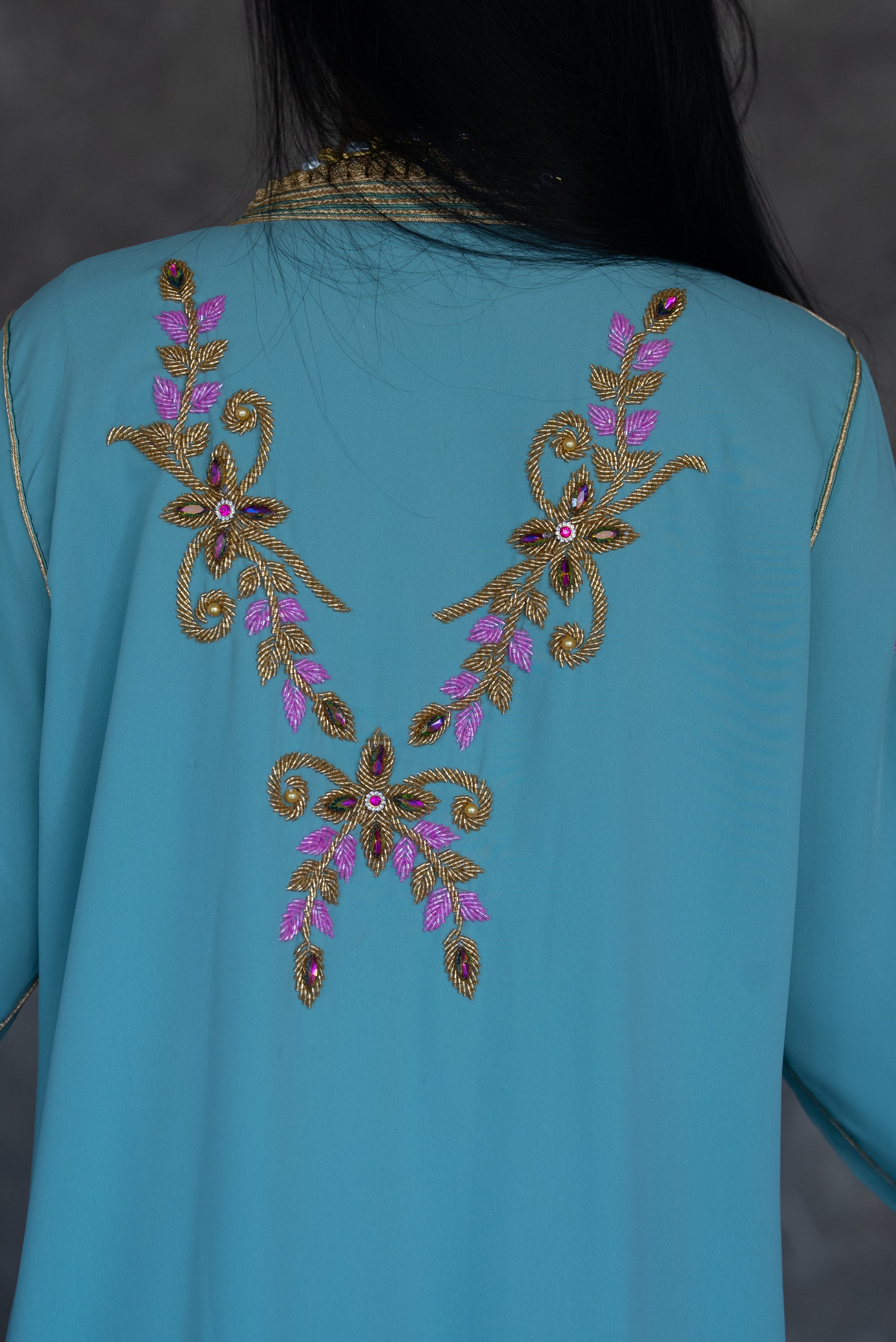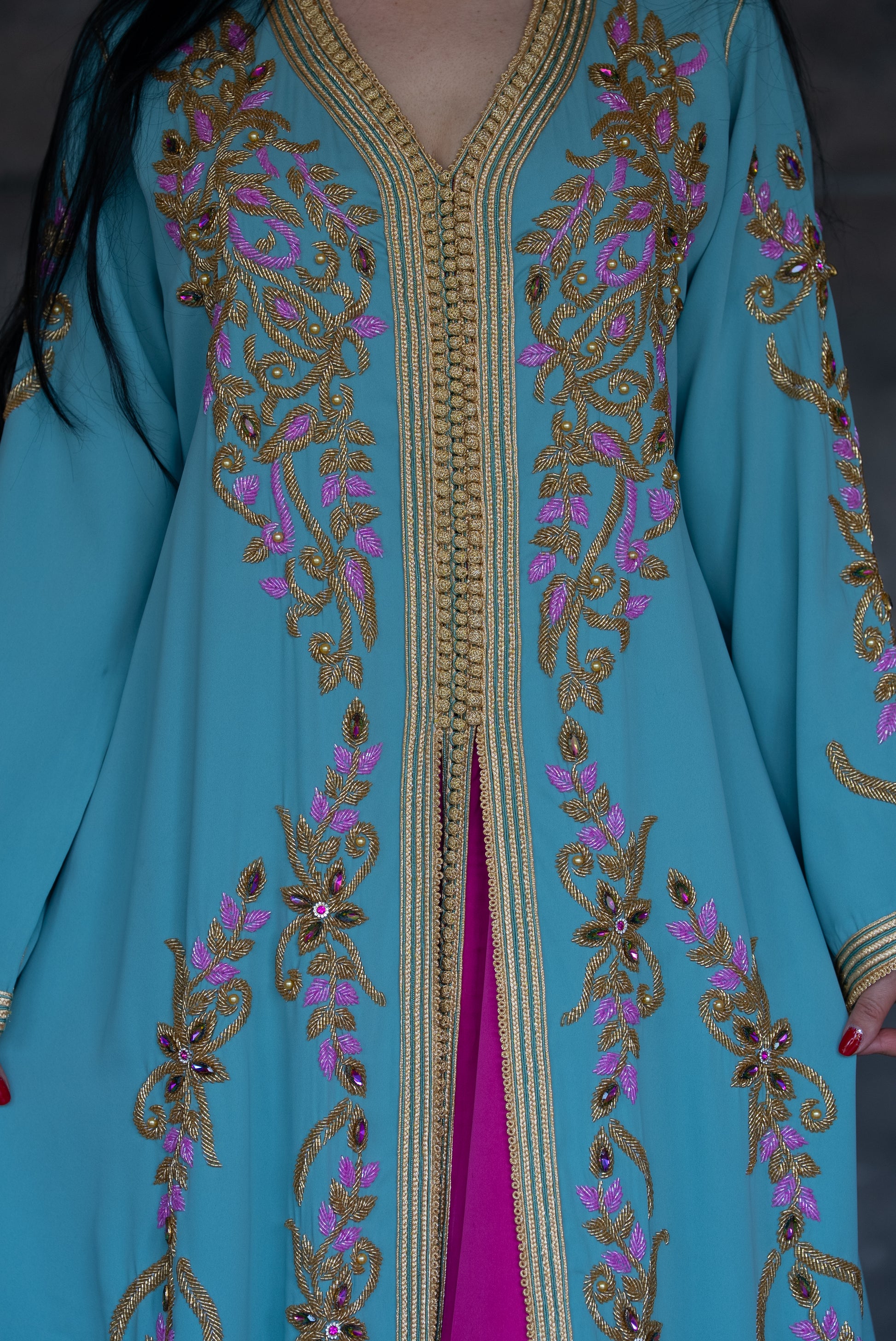 Turquoise Handmade Embroidered Caftan with Fuchsia Underlay