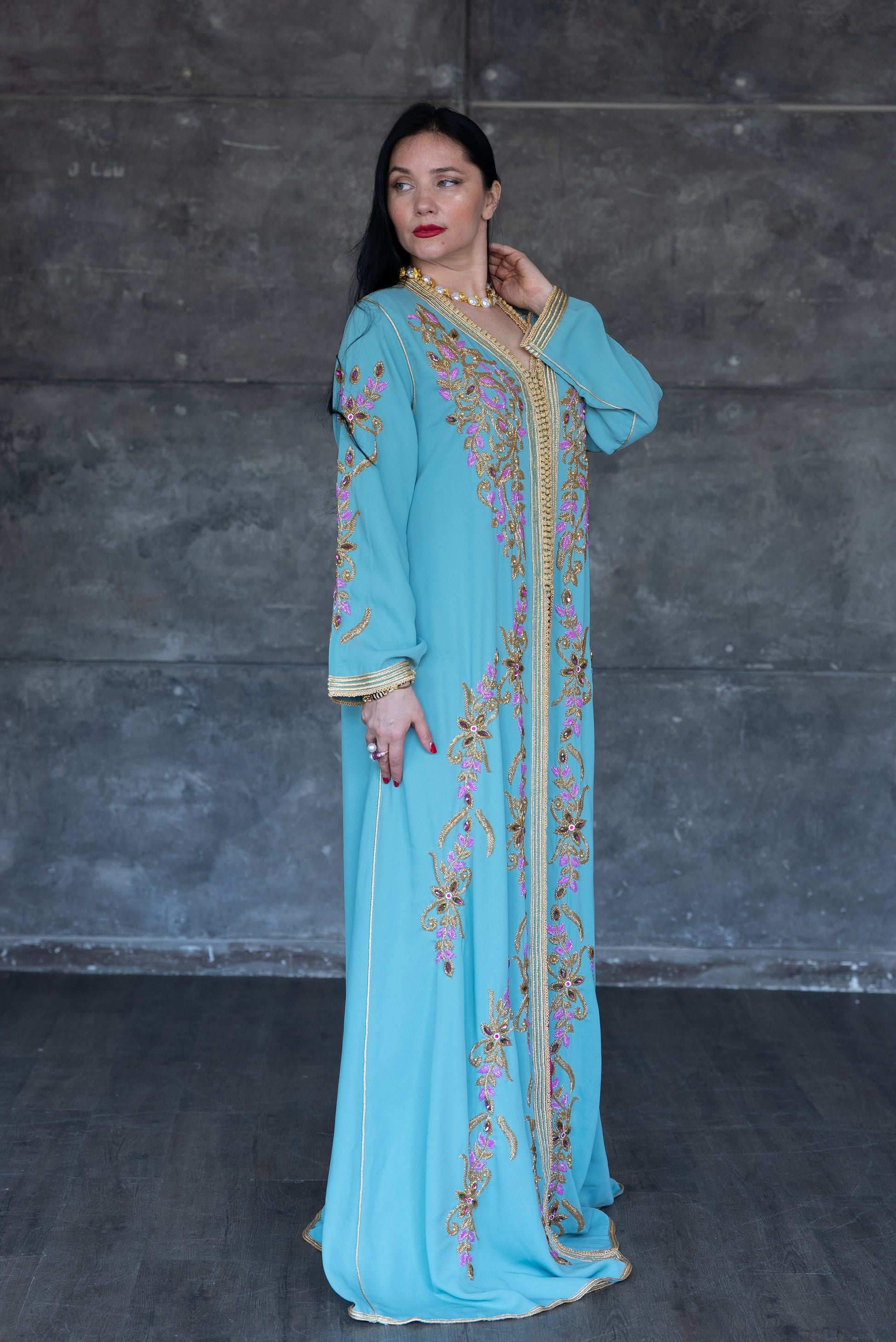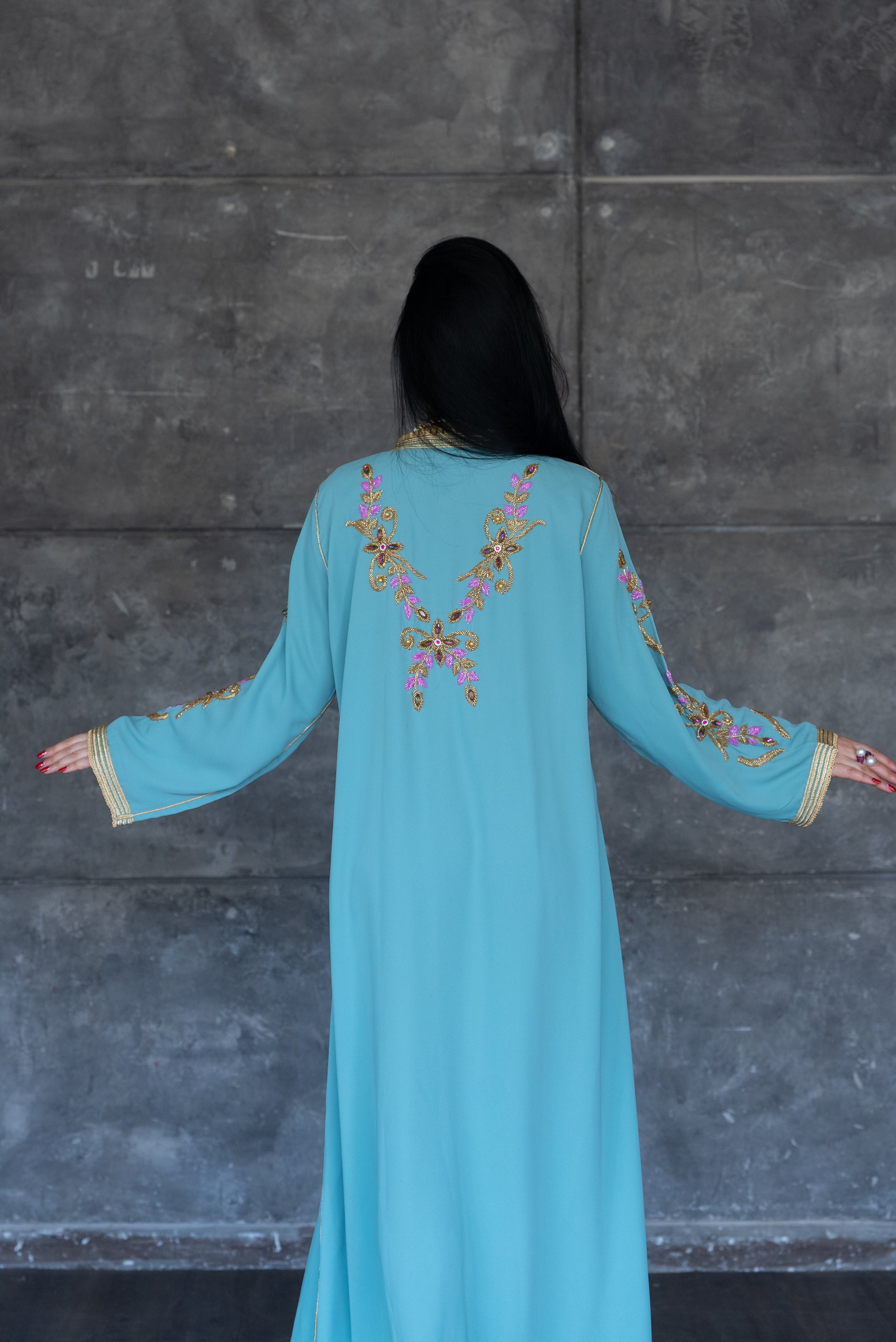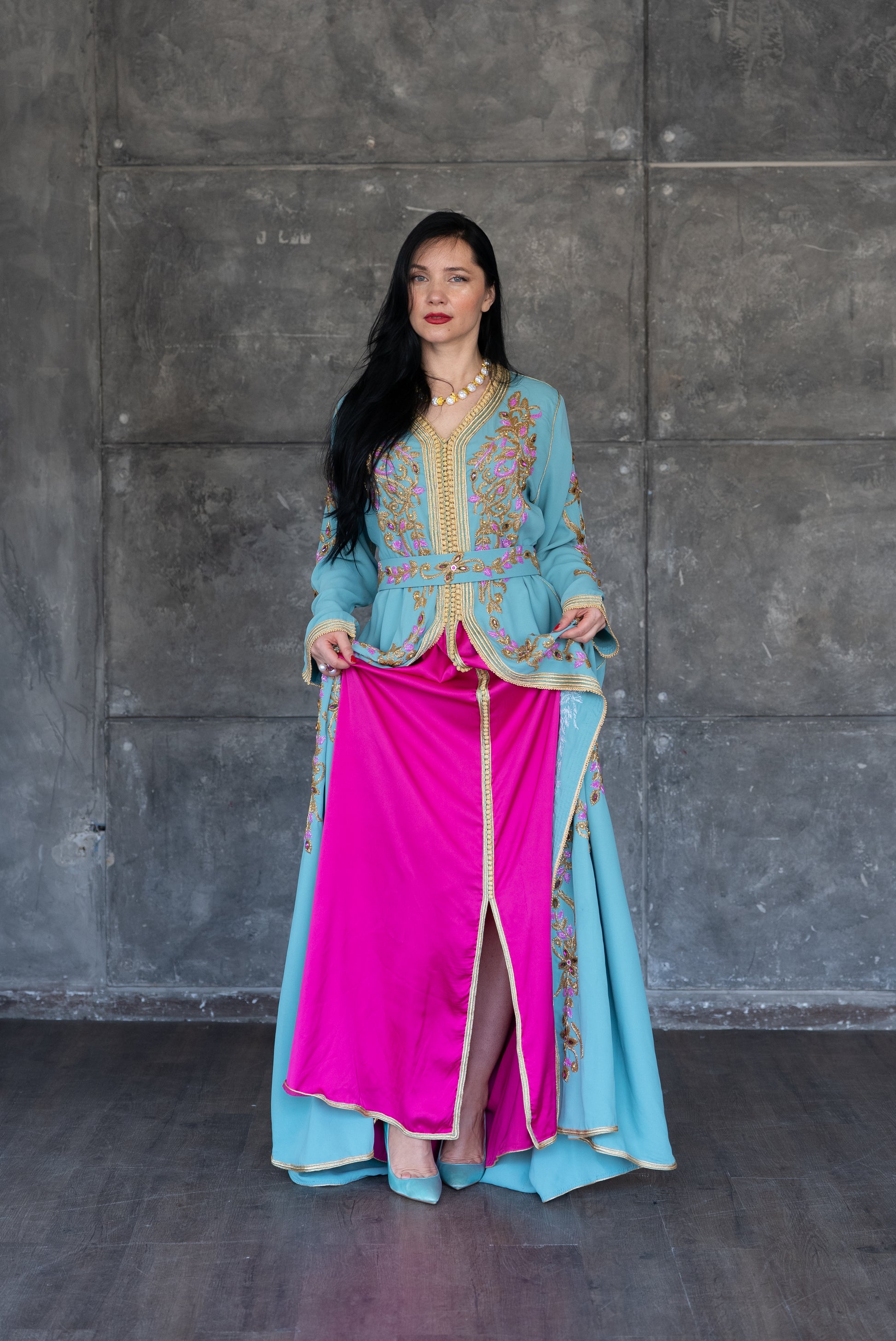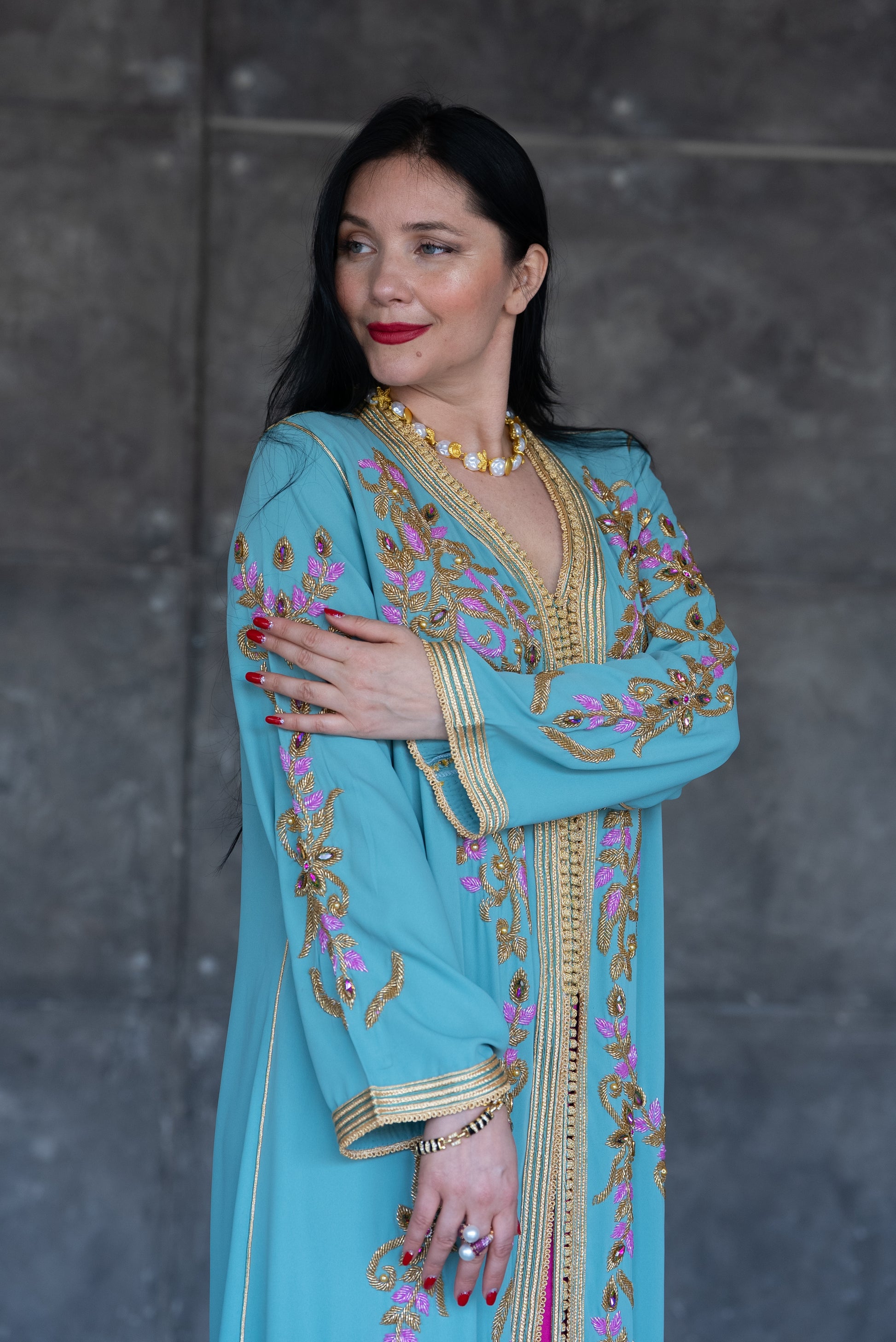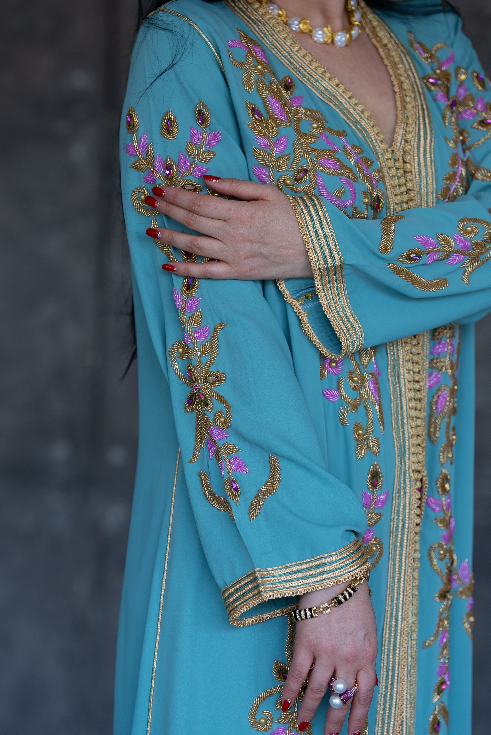 Turquoise Handmade Embroidered Caftan with Fuchsia Underlay